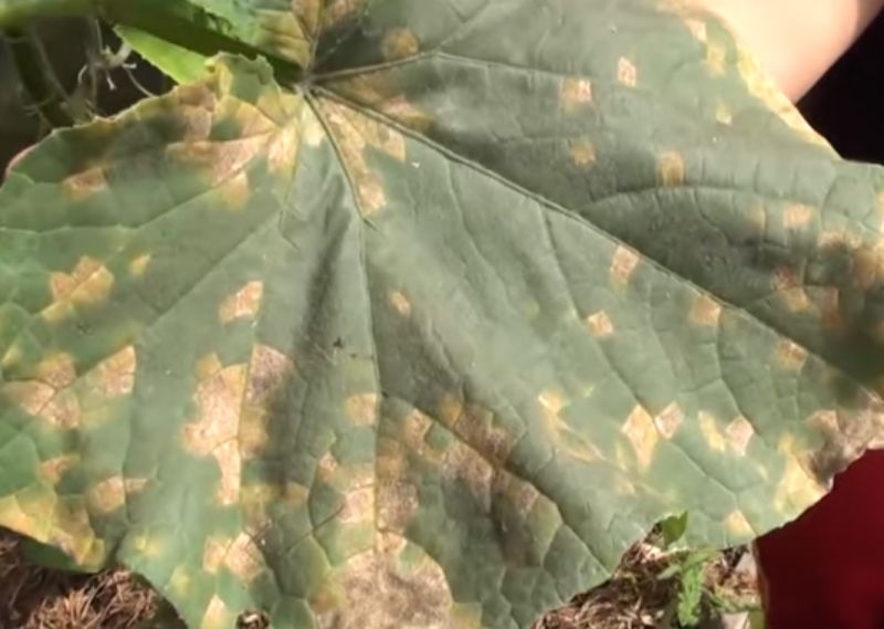 На оборотной стороне листочка огурца наблюдается серый или фиолетовый налёт. Конечной стадией заболевания является опадение листвы. Чтобы побороть заболевание, огурцы нужно меньше поливать, а почву присыпать древесной золой.