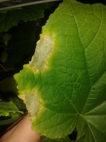Рисунок 1. Желтые угловатые пятна на верхней поверхности листа огурца.На нижней стороне таких пятен может быть виден лилово-серый грибковый нарост при высокой относительной влажности или преобладании влажных условий (рис. 2).
