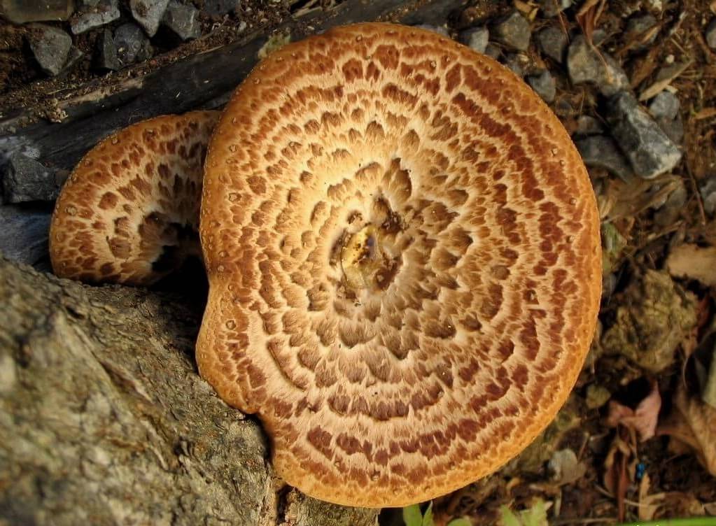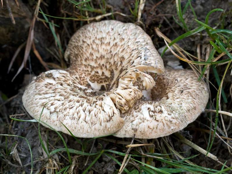 Причем несколько шляпок обычно имеют одно основание. Вырастают до 40 см и 10 кг. Используются в восточной медицине. В кулинарии предпочитают его жарить. - Пилолистник тигровый. Молодая шляпка выпуклая, со временем превращается в воронкообразную с загнутыми краями. Цвет белый, бежевый в коричневых чешуйках. Относится к сапрофитам, так как поселяется только на мертвой древесине, постепенно наращивая там белую гниль, переваривая древесные волокна. Ценен большим показателем белка в составе, но только в молодом возрасте.