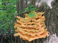 - Трутовик серно-желтый. Известен также как куриный гриб. Примечателен яркой окраской, сравниваемой с вулканической лавой. Предпочитает теплый климат, селится на старых деревьях, крепится веерообразной шляпкой к стволу, без ножки.