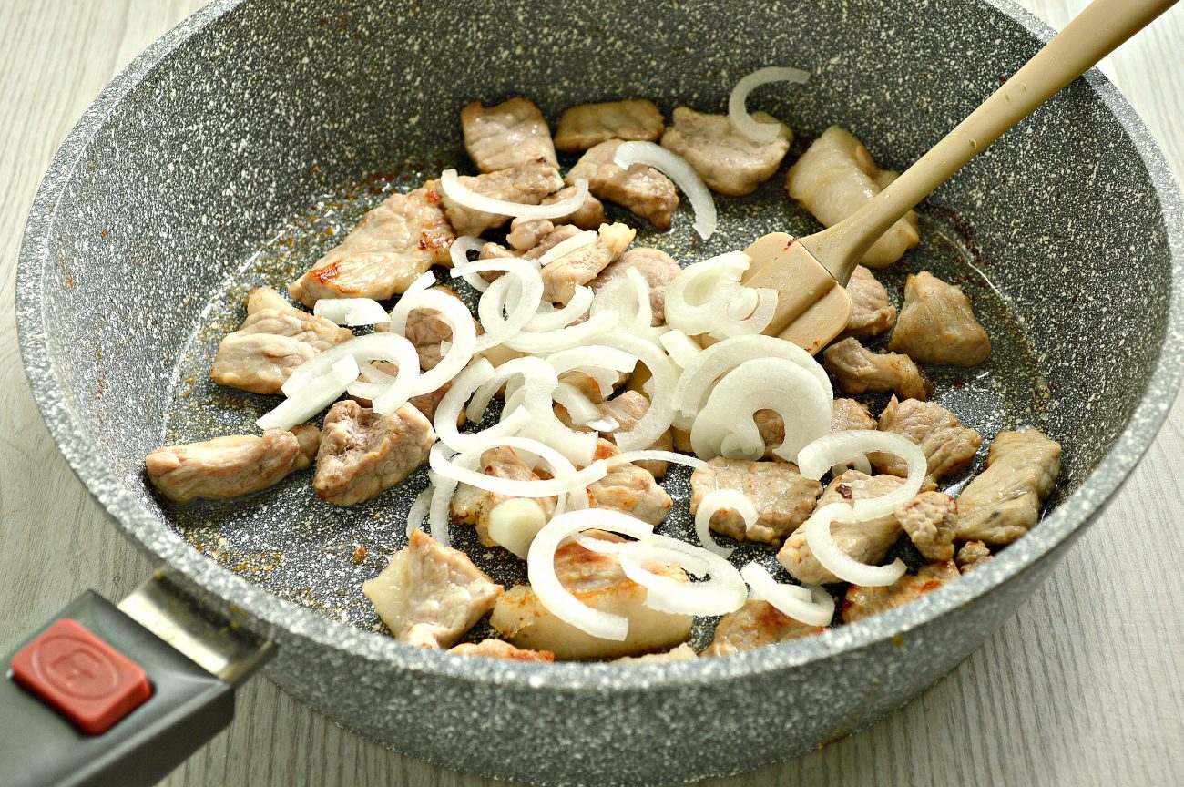 - Нарежьте мясо брусочками среднего размера, выложите на сковородку в раскаленное масло. Жарьте в течение 3-4 минут на полном огне. Затем понизьте мощность, продолжайте готовить, пока мясо не станет мягким. После переложите в миску.