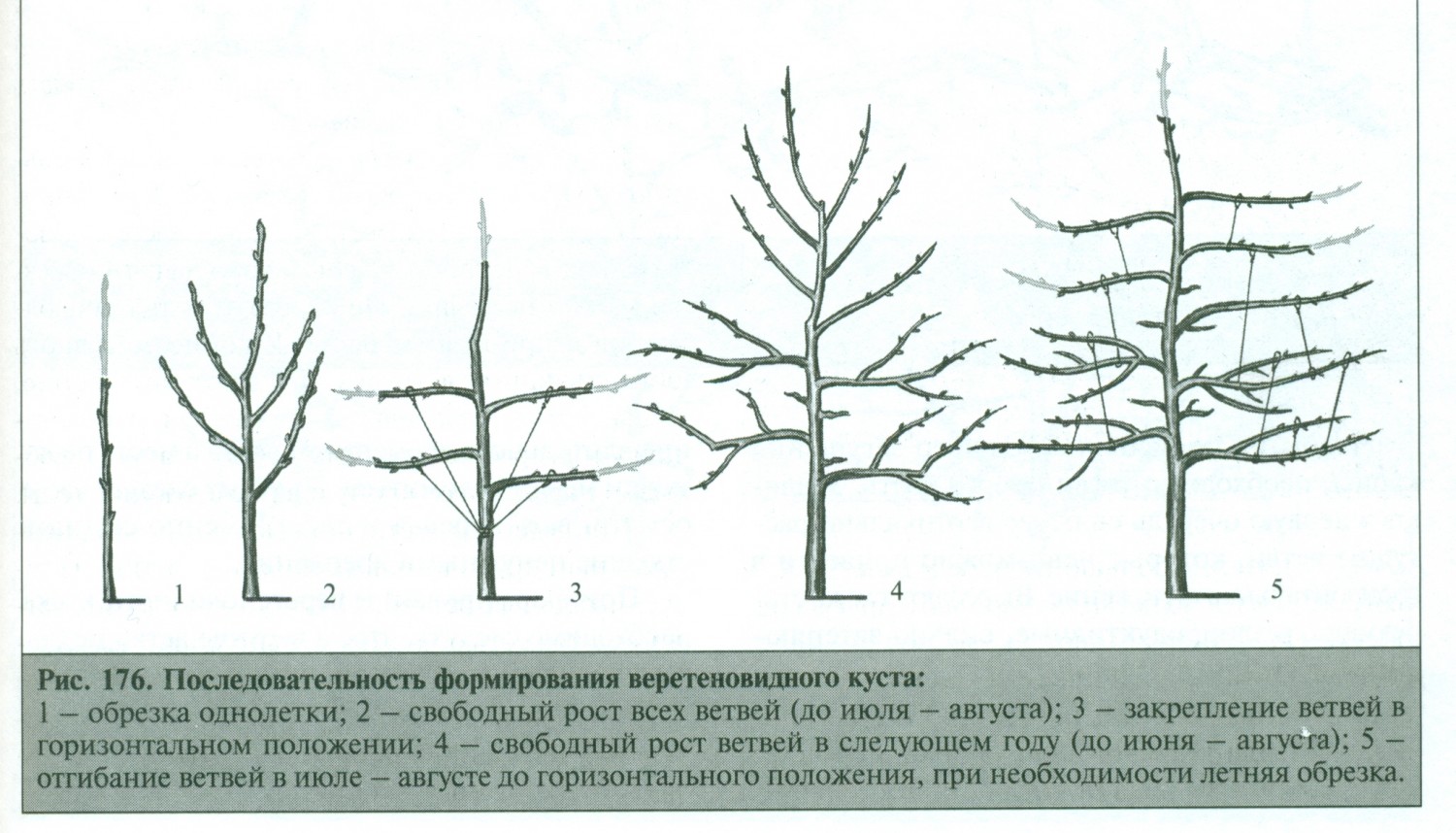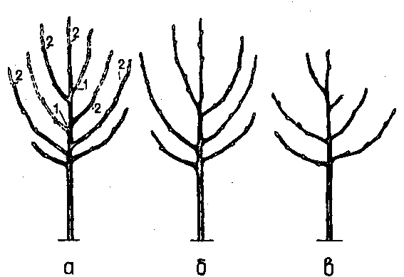 С этой целью концевые приросты скелетных ветвей и боковых побегов ежегодно укорачивают. Укорачивание веток не более чем на 1/2 их длины проводят с целью усиления их вегетации, образования плодовой древесины, особенно у основания формирования полускелетных веток, несущих на себе плодушки.
