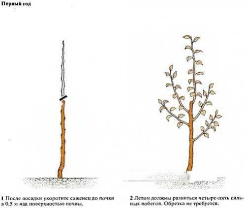 В питомниках выпускаются саженцы груши с разветвленной кроной, у которых должен быть доминирующий проводник и более слабые боковые побеги.