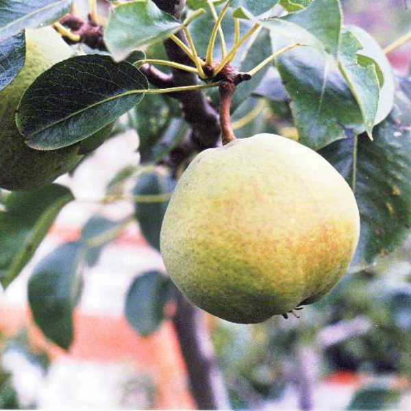 Фрукты примерно весом в 135 грамм. Имеют, как правило, форму короткой груши с воронкой тупо конической. Груши имеют зеленоватую окраску. Также имеется маленький загар размытого розоватого оттенка с южной половины фрукта.