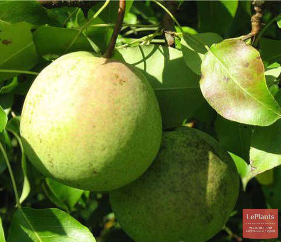 Плоды достигают веса всего в 100 грамм с удлиненно-овальной правильной формой. Имеют очень маленькую воронку. Груши стандартного зеленовато-желтого цвета с маленьким загаром с южной половины фрукта. Подробнее про сорт здесь.