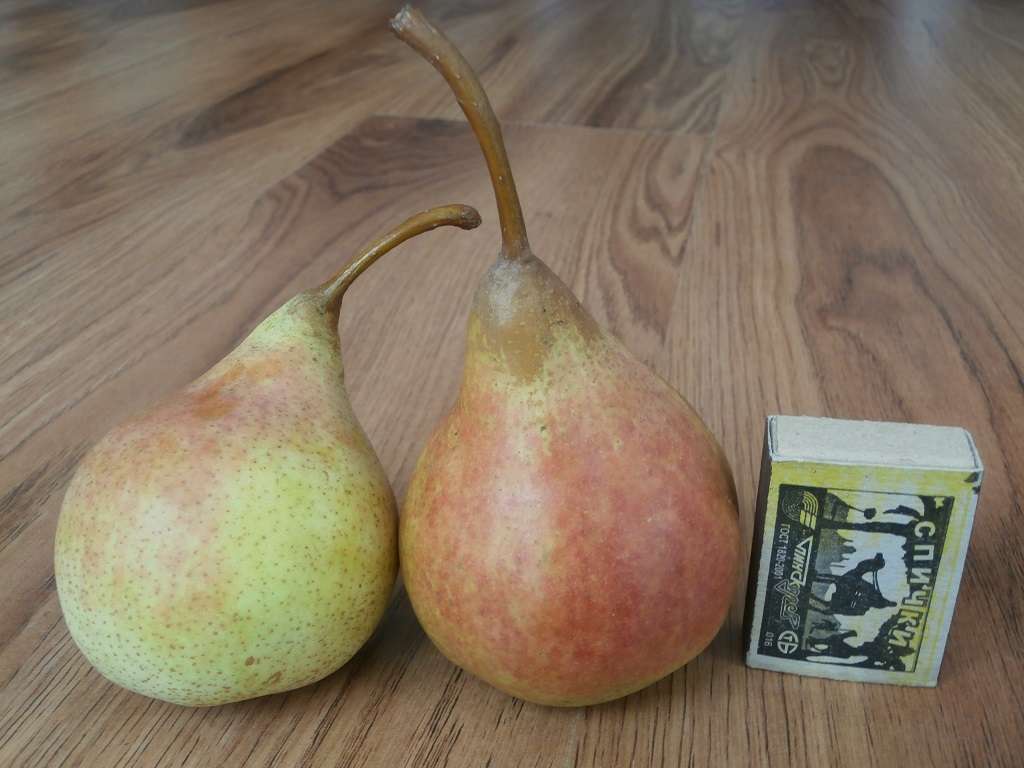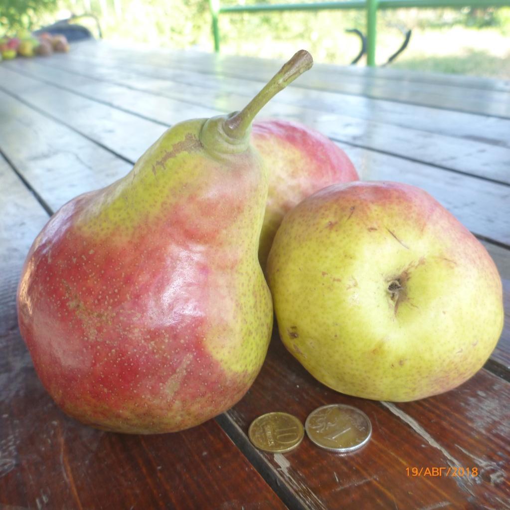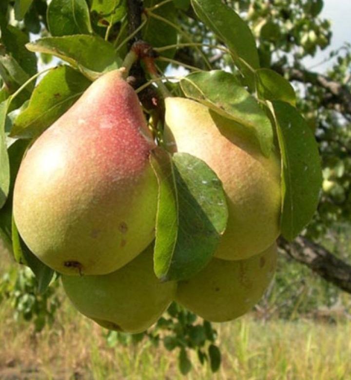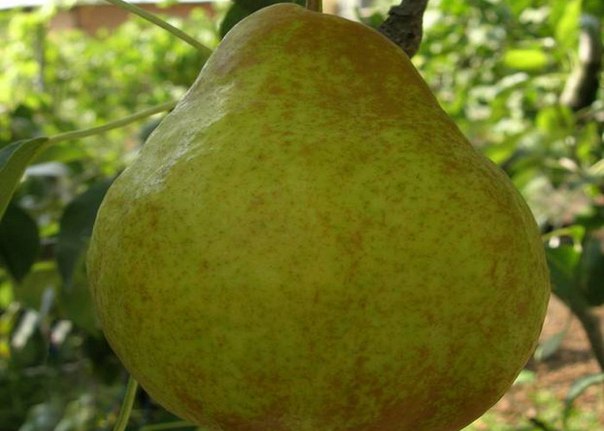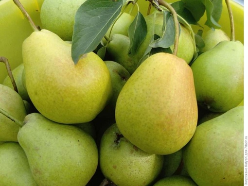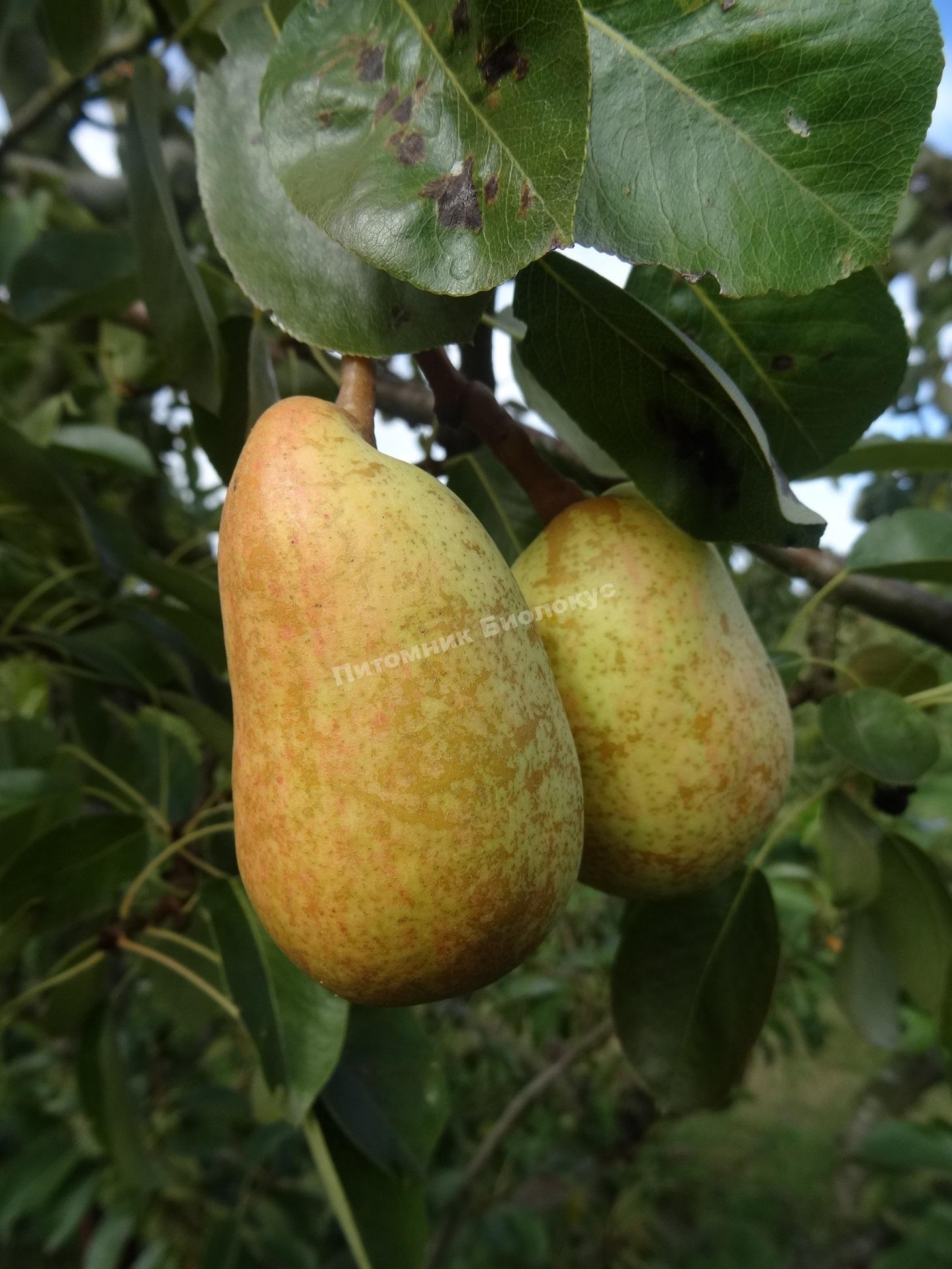 Плоды желтые с зелеными пятнами, мелкие, усеченно-конические, неоднородные. Кожица плотная, тусклая. Мякоть кремовая, сочная, средней плотности. Зимостойкий, высокоурожайный сорт, устойчивый к большинству болезней груши.