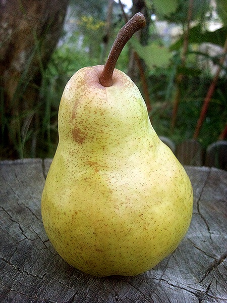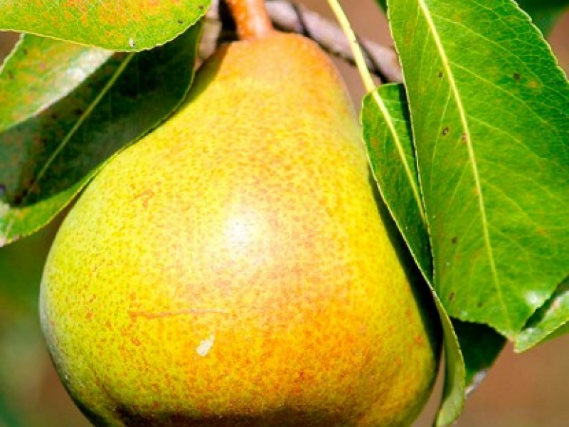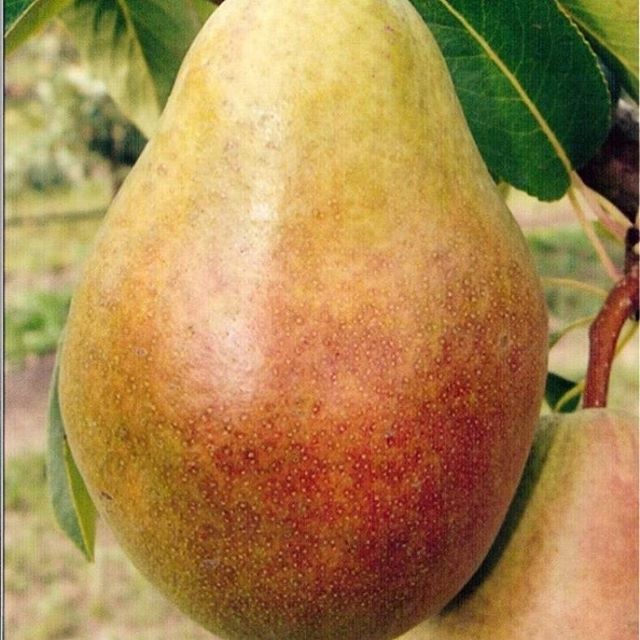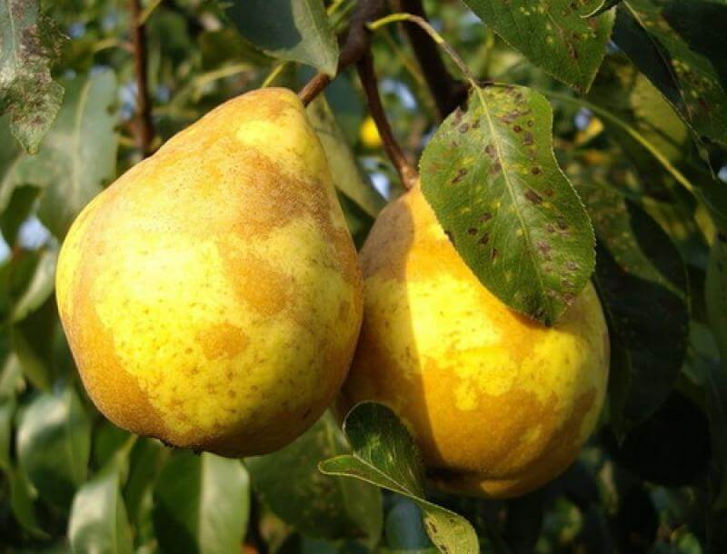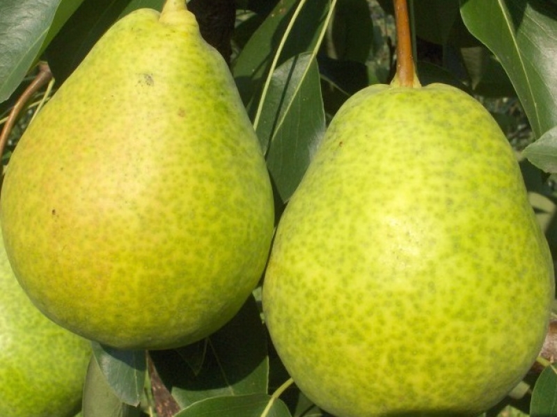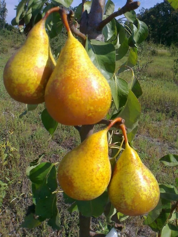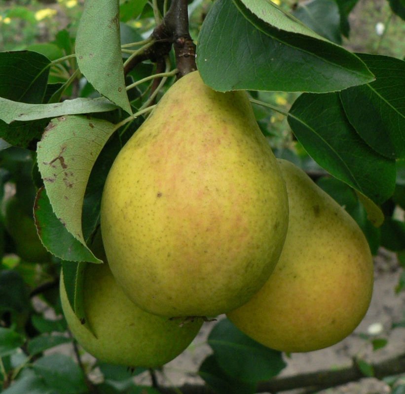 Плоды желтые с зелеными пятнами, мелкие, усеченно-конические, неоднородные. Кожица плотная, тусклая. Мякоть кремовая, сочная, средней плотности. Зимостойкий, высокоурожайный сорт, устойчивый к большинству болезней груши.