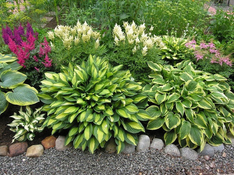 Яркий цветник создать с помощью хосты и других декоративных растений. Так как растение имеет пышные кусты и в основном однотонные, используют ее чаще всего именно в качестве фона. Астильбы и хосты в ландшафтном дизайне (см. фото) беспроигрышное решение. Красивые и яркие цветки первого растения подчеркиваются массивной зеленью второго, они уравновешивают друг друга и создают гармоничную картинку в саду.