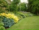 В этом саду хосты слева направо находятся Regal Splendor, Abiqua Drinking Gourd, Montana «Aureomarginata» и граница Stiletto.