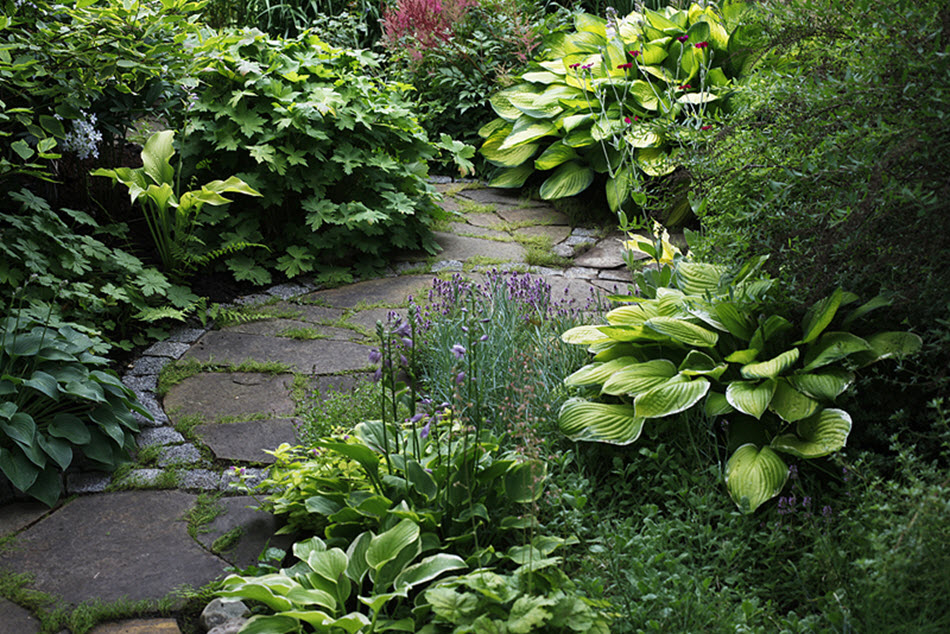 Территорию сада, которая практически вся находится в тени, необходимо дополнительно «подсветить». Лучше всего с этой задачей справятся растения нежно-розового, светло-желтого или лавандового цвета. Растения с темно-зелеными листьями будут делать экстерьер еще более темным.
