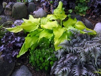 гейхера, хосты и хвойные, сочетание групп с теневыми кустами и выбор стилей, японский или «хай-тек»