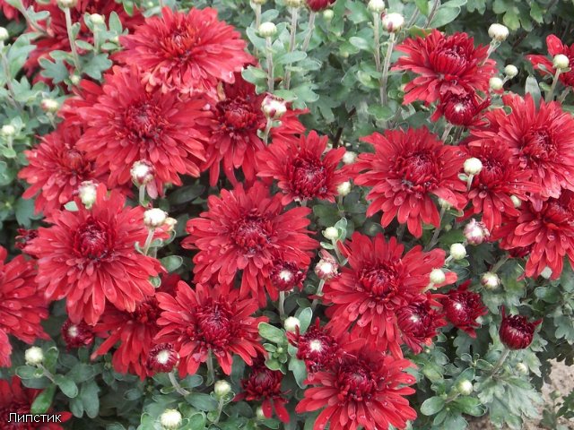 Сорт хризантем липстик относится к среднецветковым, имеет соцветия в диаметре до 6 см. Сам куст невысокий, но стебли ростом до 40 см крепкие, и кустик не разваливается в стороны. Хорошо подходит для создания ограждения для более высоких растений или средней части многоуровневой клумбы.
