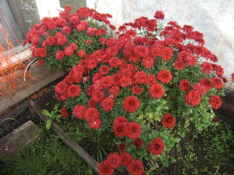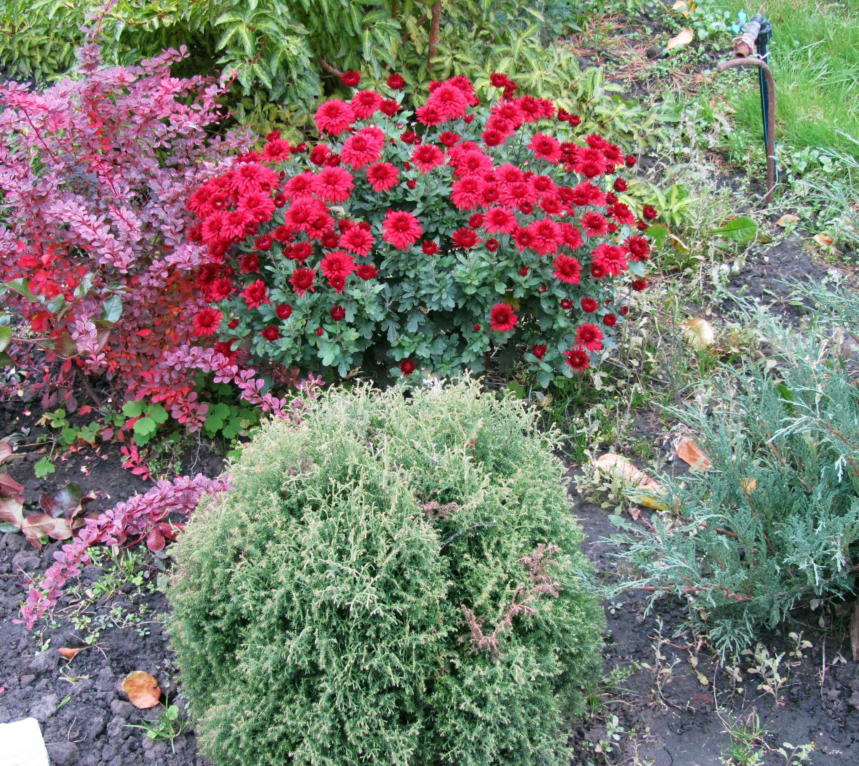 Хризантемы, полученные от деления старого куста, купленные в питомнике контейнерные хризантемы, или укорененные черенки, высаживаем рядами в зависимости от крупномерности кустов: на расстоянии 20-30 см друг от друга низкорослые и среднерослые сорта, 45-50 см – крупнорослые сорта.