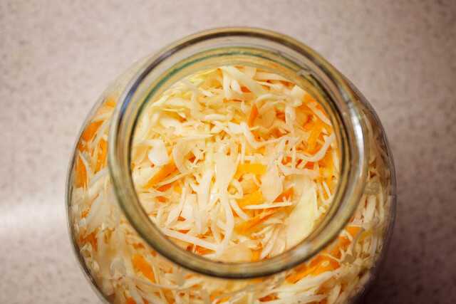 Пробуйте квашеную капусту каждые несколько дней, пока она не приобретет желаемый вкус. Как только он попадет туда, снимите груз, накройте банку воздухонепроницаемой крышкой и храните ее в холодильнике.