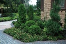 Входная зона участка может быть оформлена в парадном стиле: четкие формы подстриженных туй шарообразной и конической формы встречают гостей и хозяев около входа в дом. Их окружает ухоженный газон или цветная измельченная кора сдержанных оттенков.