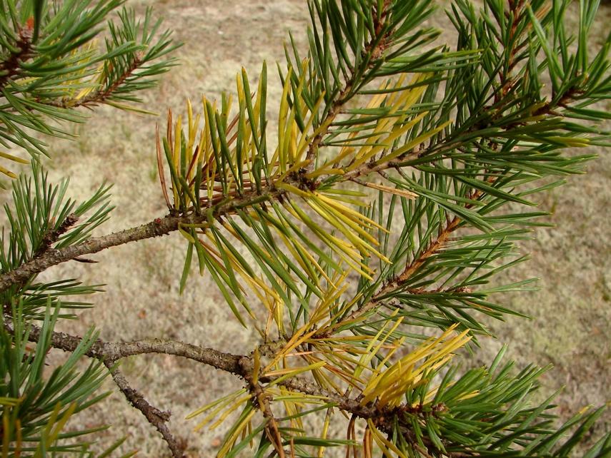 К пятихвойным относится одна из самых красивых сосен — веймутова сосна. Хвоя на ее тонких, длинных, слегка поникающих веточках отмирает быстро, сохраняясь обычно лишь на 10-15-сантиметровых кончиках. В условиях средней полосы России мягкая нежная хвоя веймутовой сосны доставляет дереву немало неприятностей. Из растущих в наших садах и парках хвойных именно это дерево больше всего нравится воронам. Его хвоя служит им зимой источником витаминов. В результате весной после стаивания снега земля под веймутовыми соснами бывает покрыта толстым слоем оборванных воронами веток. Причем вороны обдирают эти хвойные не только в городе, но и в лесу.