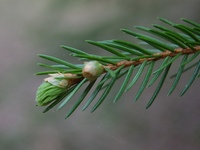 Есть еще одно, не слишком знакомое жителям средней полосы хвойное растение — псевдотсуга. Внешне оно удивительно похоже на ель. От ели отличается, прежде всего, формой шишек. Шишки псевдотсуги образуются не на концах молодых веточек, а на побегах прошлого года и имеют далеко выступающие кроющие чешуи с длинными «хвостиками». Хвоя псевдотсуги располагается по всей ветке, как у ели.