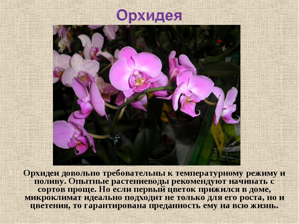 Орхидеи считаются требовательными растениями, но многие из них прекрасно себя чувствуют и цветут в горшочках на подоконнике, как и другие комнатные растения. Уход заключается в обеспечении подходящего грунта, освещении, полива, влажности воздуха, пересадки, правильного питания.