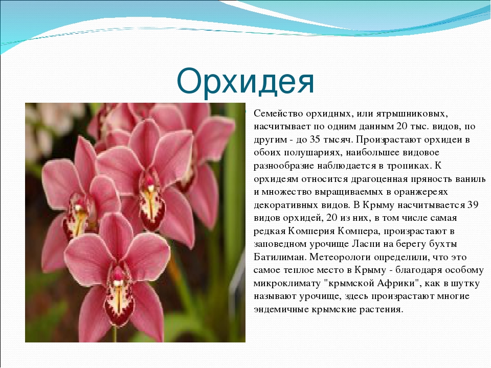 Это подлинный уникум среднерусской флоры, выделяются среди зеленых друзей обликом и редкостной целебной силой… На территории России произрастает около 150 видов орхидеи. Их можно встретить на лесных полянах, опушках, лугах, заболоченных местах. Это ятрышники нескольких видов, любка двулистная, она же ночная фиалка, названная так за душистый ее аромат, особенно ночью, а также венерин башмачок, дремлик болотный, калипсо луковичная, ореорхис раскидистый…