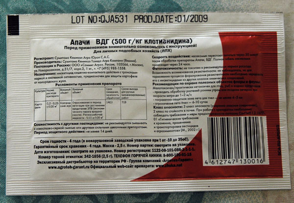 Чтобы защитить на личном приусадебном участке картофельные посадки площадью в 2 сотки от колорадского жука, необходимо пакетик Апачи, весом в 0,5 г развести в 1 л воды. Для обработки территории в 10 соток потребуются 5 пакетиков по 0,5 г или один 2,5-граммовый пакет на 5 л воды.