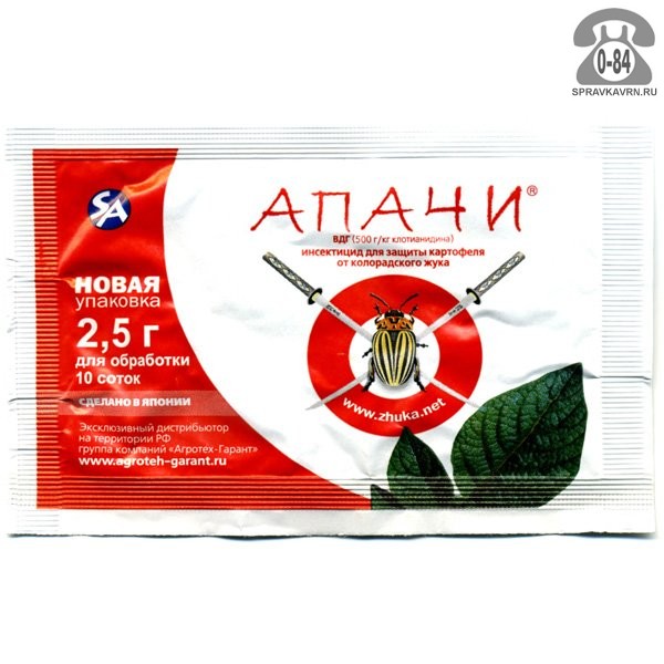 «Апачи» – инсектицид кишечного-контактного и системного действия. Препарат изготавливает японская компания «Сумитомо Кемикал». Активный компонент средства – клотианидин (неоникотиноид, концентрация – 500 г/кг). Вещество воздействует на нервную систему различных листогрызущих и сосущих насекомых, блокирует передачу нервного импульса, что приводит к гибели вредителей.