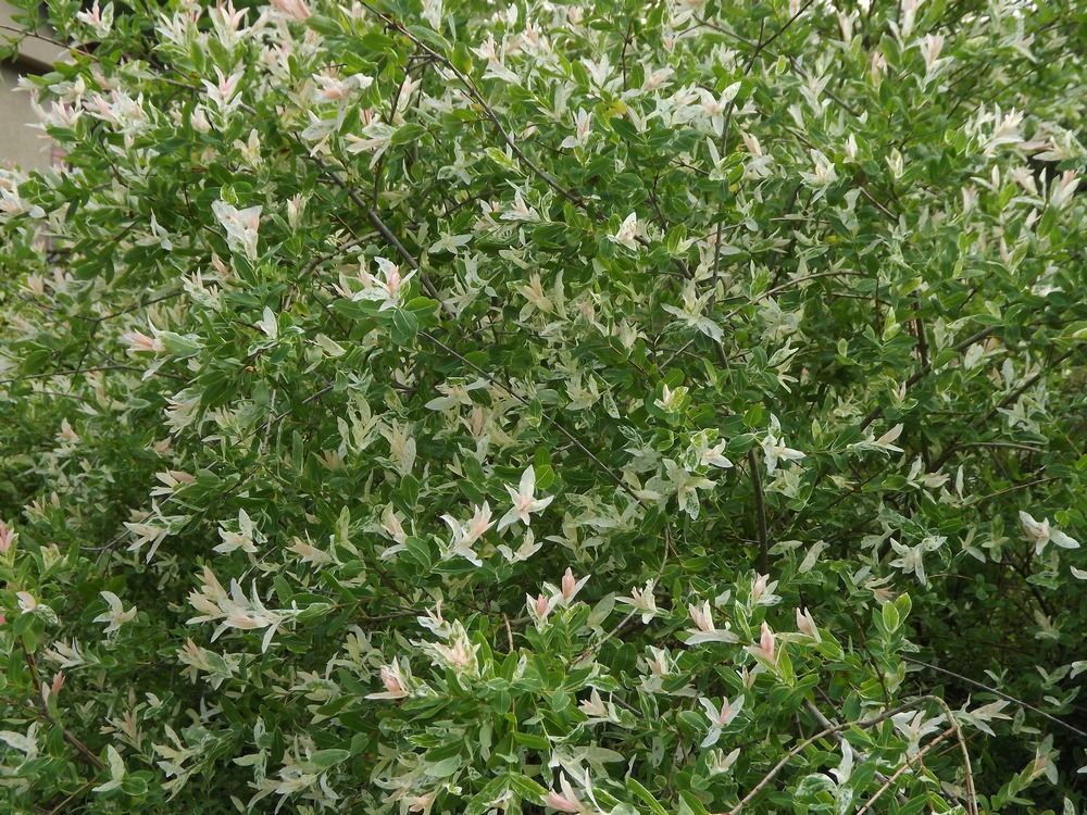 Имеет необычную окраску листвы: у него бело-розово-зеленые листья, с четкой локализацией цветков по всей площади.Висячие побеги. Общее впечатление от куста, особенно издалека, что он бело-серебристый, дымчатый, и только подойдя поближе, можно увидеть истинную картину окраски дерева. Цветет в мае, цветки желто-зеленые.