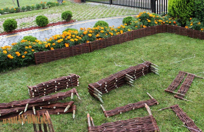 Окантовка из плетня не только выглядит по-деревенски колоритно, но и удержит землю на грядке от вымывания дождём. Плетёные подпорки особенно хороши для раскидистых кустарников.