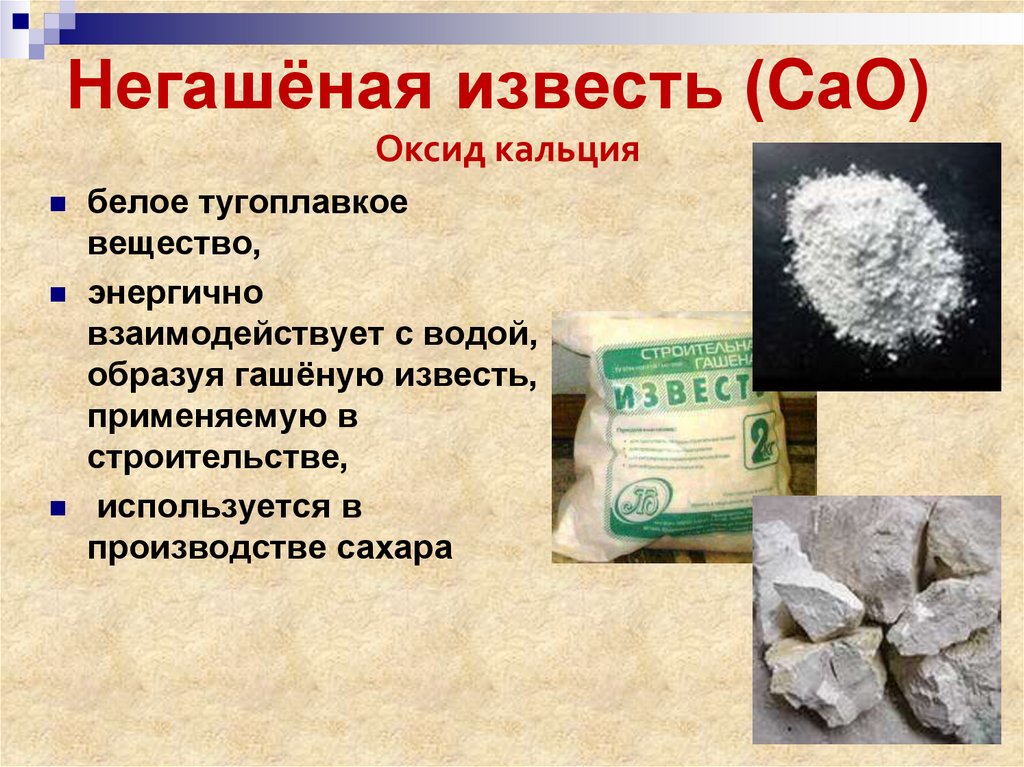 | Оксиды | CaO — оксид кальция, кальция |