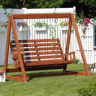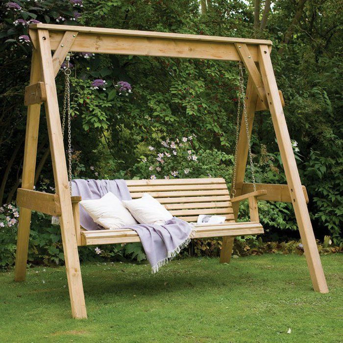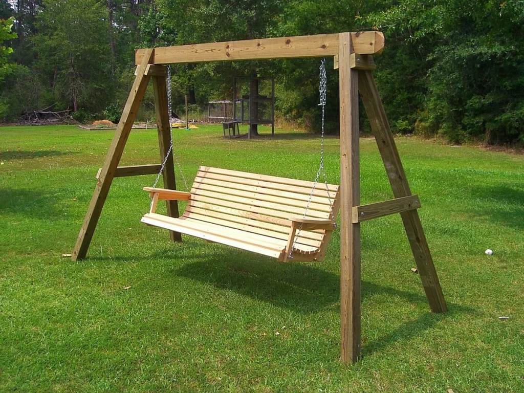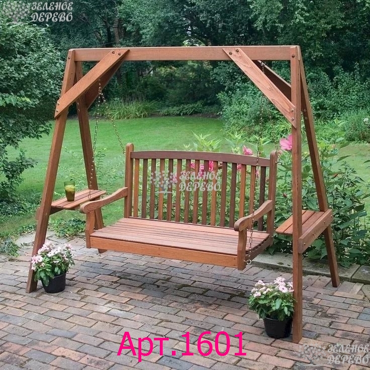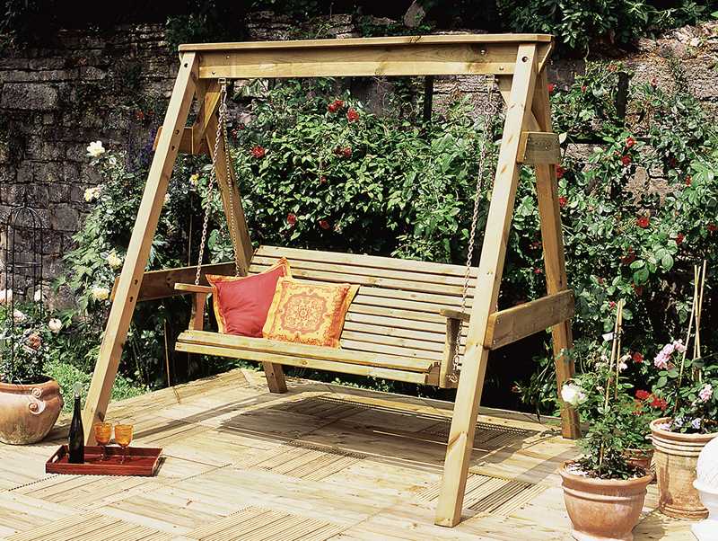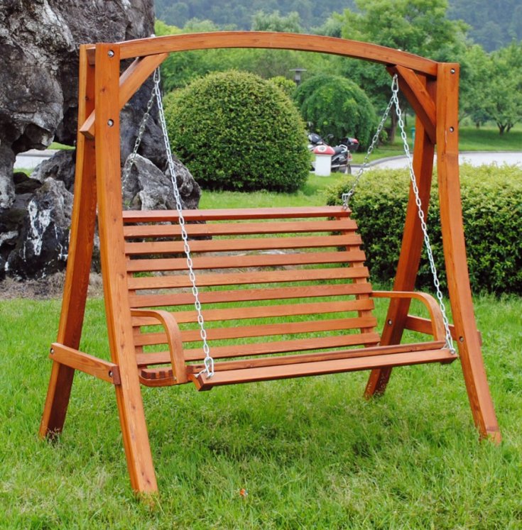 Материал обладает массой положительных характеристик, дающих возможность создавать привлекательные конструкции, подходящие к любому ландшафтному дизайну. Древесина – экологически чистый материал, а потому совершенно безопасен для человека. Чтобы продлить срок службы деревянных уличных качелей, необходимо оснастить их навесом, защищающим от осадков и пересыхания под солнечными лучами. Избежать поселений насекомых помогают различные антисептики, они же справляются с гнилостью и грибками. Дерево – универсальный материал, который легко поддается обработке, поэтому можно дополнить уличные качели различными резными узорами, фигурными элементами.