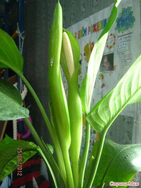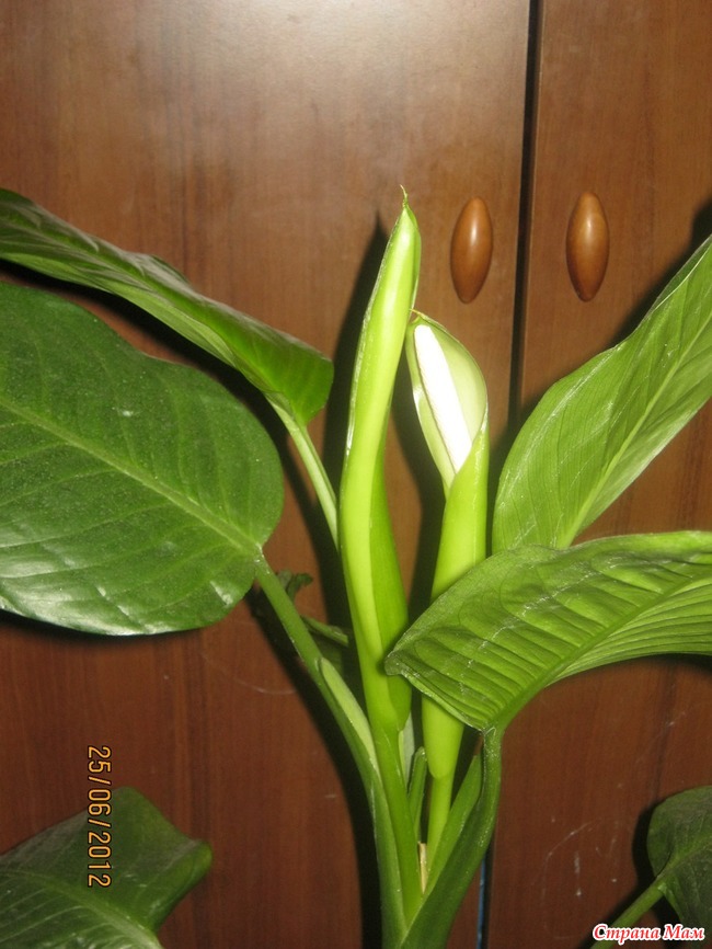 Не многие цветоводы могут сразу разглядеть бутон. Цветонос появляется из пазухи листьев и вначале он похож на новый лист. По мере роста, края покрывала расходятся и соцветие становится более заметным.