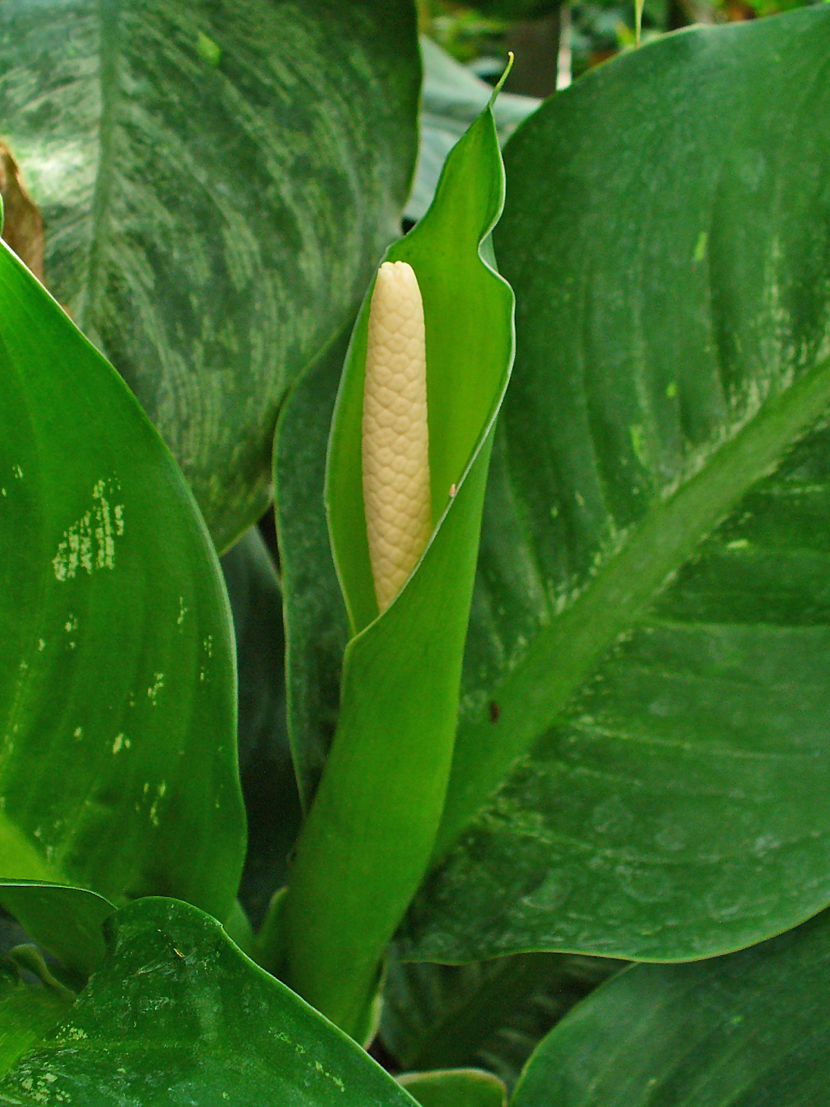 Общая форма растения — листья, образующиеся на коротком стебле, укоренившемся в земле (не виноградная лоза и не древесное растение), — а также особенности покрова и початка позволяют предположить род Dieffenbachia. Диффенбахия произрастает в тропической Америке, некоторые виды встречаются в Мексике. Я знаком с Dieffenbachia , потому что некоторые из ее видов выращиваются в горшках в умеренной зоне, и раньше у меня был такой.