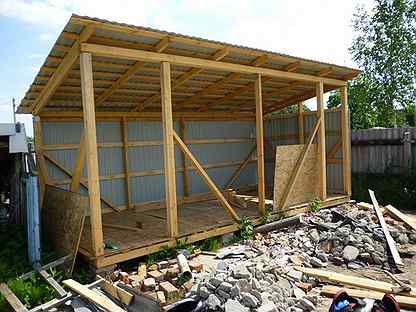 Для построения односкатной крыши, необходимо к верхним балкам строения прикрепить брусья перекрытия, которые выступают за границы каркаса минимум на 0,5 м. Делается это для того, чтобы защитить стены сарая от дождевой воды.