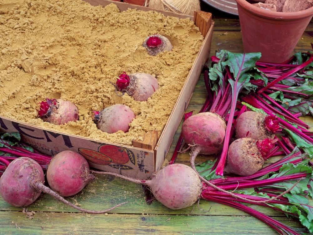 Для длительного хранения свеклы засыпьте свеклу с удаленной зеленью в ведро, наполненное влажным песком или опилками.