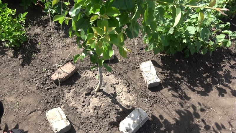 Зафиксировав дерево в таком положении минут на 30, затем я восстановил его вертикальное положение. Добавив в землю старого навозного перегноя, полностью засыпал корневую систему. Хорошо укрепил дерево, сделав 4 растяжки в разные стороны. Ствол дерева обязательно обмотайте мягкой тканью! И хорошо полил. В течение сезона была произведена подкормка микроэлементами, а во второй половине августа подкормка сульфатом калия и суперфосфатом (по 100 граммов). Это хорошо помогает вызреть, наросшей за лето, древесине, а следовательно, удачно перезимовать дереву.