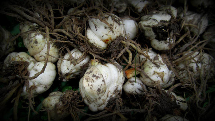 Чтобы не повредить луковицы при извлечении из грунта, землю со всех сторон от растения протыкают вилами, а затем аккуратно поднимают земляной ком.