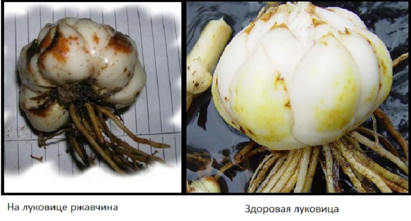 - При появлении гнили ее убирают ножом, обработав места среза раствором бриллиантовой зелени. Если луковицы сильно повреждены, их выбрасывают.