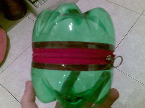 Приступим к работе. Возьмем бутылку и в нижней ее части сделаем надрез таким образом, чтобы задняя стенка осталась целой, а низ открылся. В получившееся отверстие пришиваем молнию при помощи иглы и нити. Чтобы облегчить работу, молнию можно приклеить.