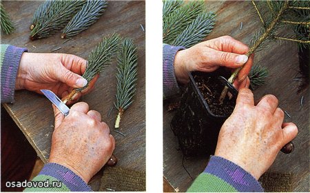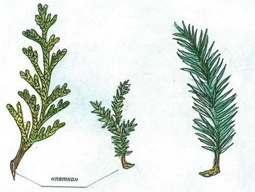 Кончик сорванного побега с «древесной пяточкой» необходим как основа для новых корешков. Если кора отслаивается, ее нужно слегка выровнять, зачистить ножом. В противном случае черенок либо загниет, либо высохнет. Нижняя их часть должна быть освобождена и от хвои, чтобы избежать образования гнили при соприкосновении с песком.