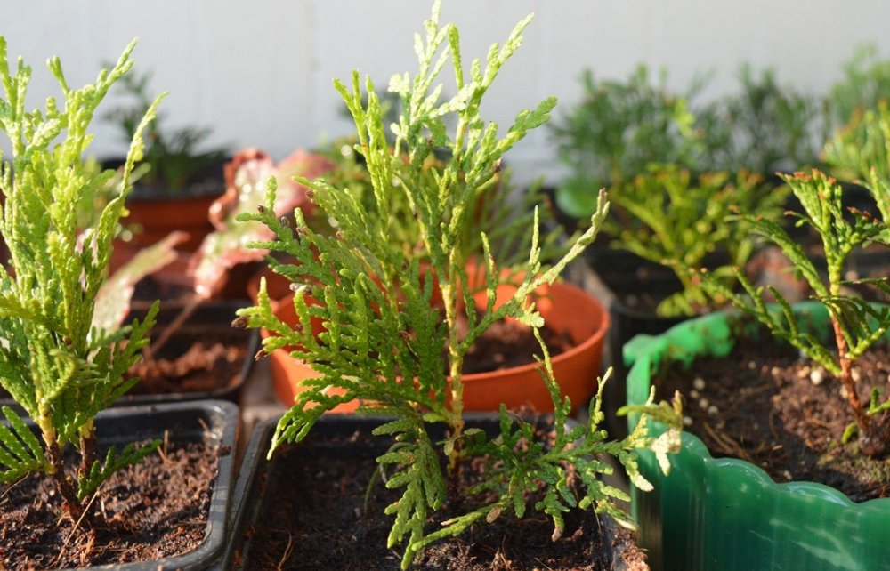 Благодаря этому побеги, предназначенные на рассаду, можно будет сразу же посадить в землю, не теряя времени. Под саженцы туи можно подготовить пластиковые горшочки диаметром около 7 см или заполненные землей ящики высотой 20 см (тогда, после укоренения, саженцы пересаживают в отдельные горшки). Саженцы туи погружают в субстрат на глубину около 2 см. В одном горшке можно разместить несколько черенков.