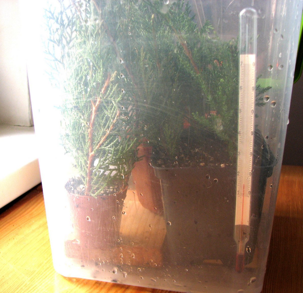 После посадки, новые саженцы туи следует полить. Зиму они должны провести в теплом и светлом месте, но не под прямыми солнечными лучами, чтобы палящее солнце их не пожгло. Нужно следить, чтобы субстрат был постоянно влажный. Идеальной температурой для укоренения рассады туи является диапазон от 18 до 22°C. Нелишним было бы поместить горшки с саженцами под пленку или стекло, это поможет сохранить тепло и влагу в воздухе вокруг черенков. Туя довольно легко укореняется и корешки должны появиться в течение двух месяцев.