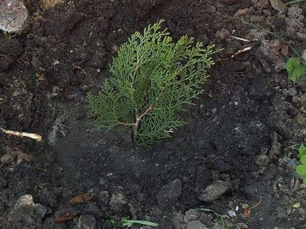 Перед высадкой растения в открытый грунт в лунку нужно положить смесь компоста, навоза и садовой почвы. Корневая система туи не должна быть надломленной, а корневую шейку следует оставлять над землей.