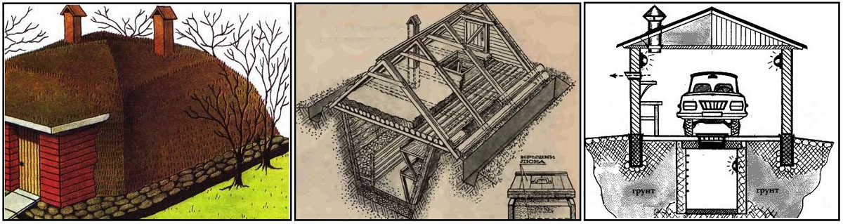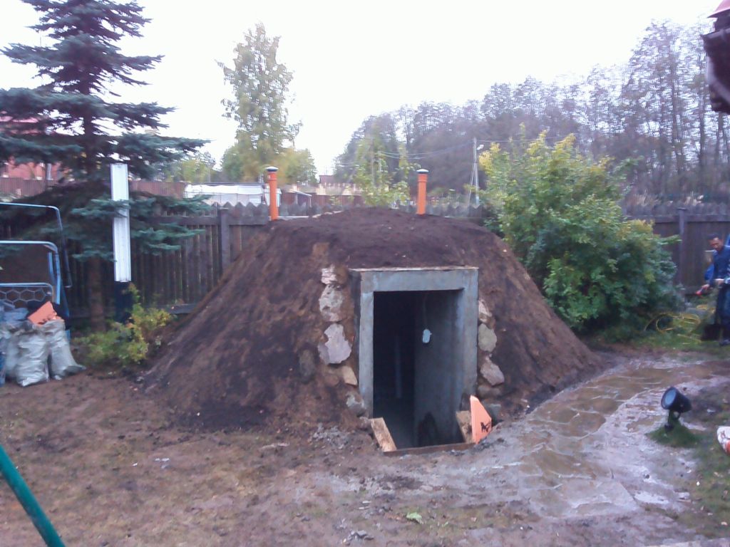 Для исключения вероятности промерзания сооружение на улице покрывают слоем земли толщиной не менее метра (получится такой бугор над землей). Погреб под домом утеплять не нужно.