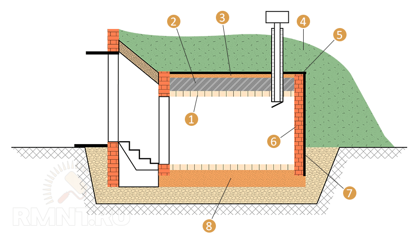 В таком случае дождевая и талая вода будет стекать вниз по склону, а не скапливаться около стен хранилища. Стандартная глубина погреба – 2,5 – 3 метра.
