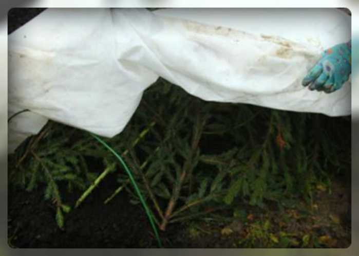 Пучки обмотать шпагатом, зафиксировать у земли железными дугами, обильно забросать лапником. Поверх конструкцию нужно покрыть тканым материалом. Этот способ дает возможность прохождения воздуха сквозь укрытие, в результате уменьшается опасность заражения грибками и гнилью. Края нетканки закрепляют грузом.