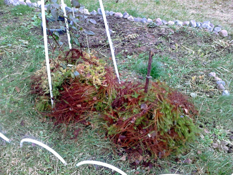 После того как розы были пригнуты к земле, их необходимо тщательно укрыть. Укрытие необходимо после того, как розы слегка подморозит, так как закаливание для них бывает очень полезно. Плети не должны соприкасаться с почвой, поэтому между ними нужно уложить рубероид или хвойные ветки.