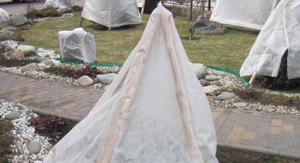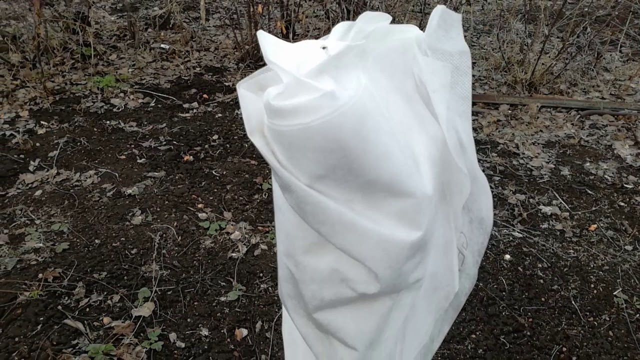 - Для наземной части. Для обёртывания верхней части дерева обычно используют мешковину, агроволокно, полиэтиленовую плёнку. Но лучший вариант — спанбонд. Он стоит дороже других материалов, зато обеспечивает создание благоприятного микроклимата под укрытием и может многократно использоваться.