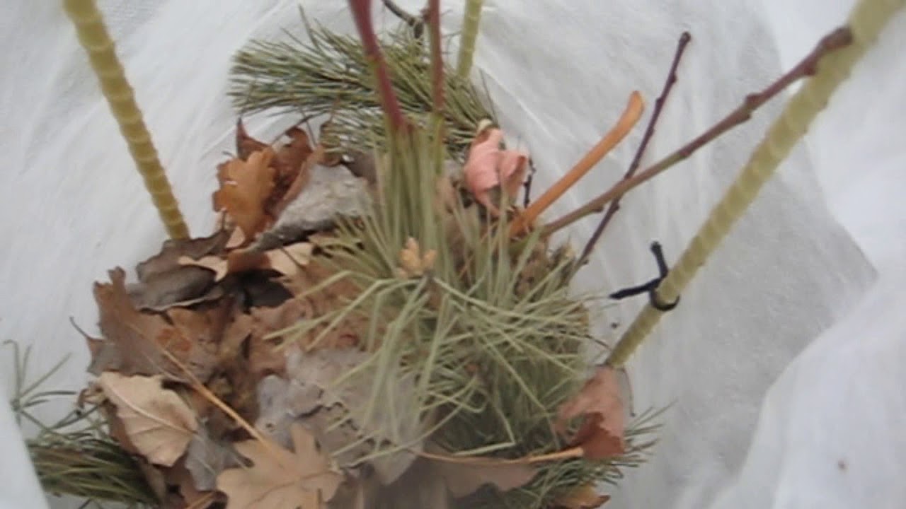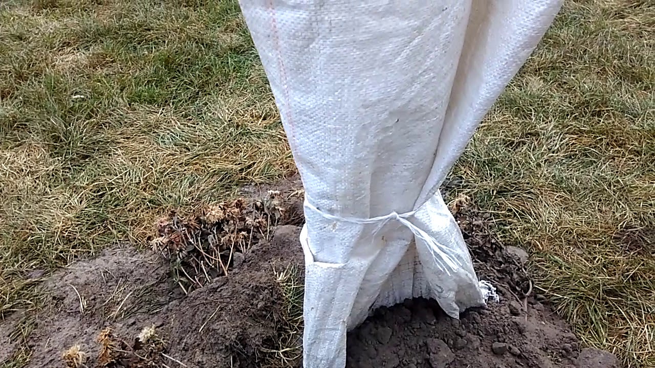 - Вокруг ствола накидайте слой соломы или сена, и обмотайте его мешковиной и верёвками, чтобы не раздуло.