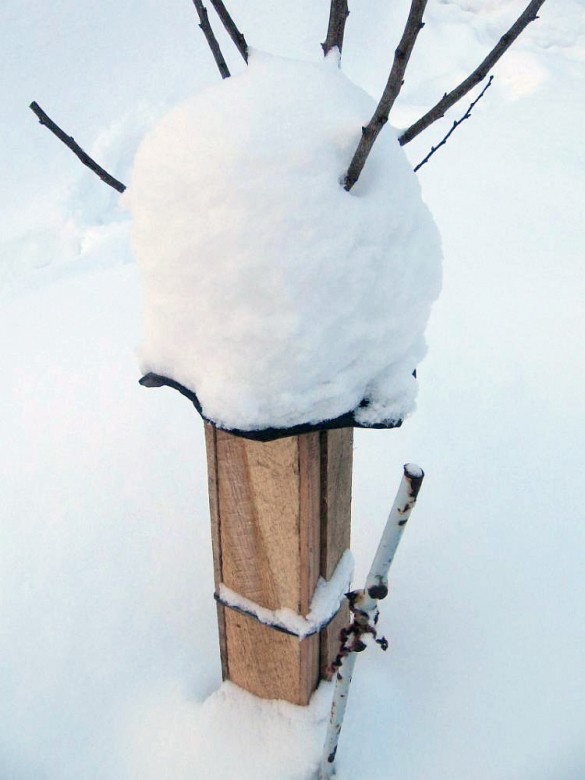 Они устанавливаются вокруг молодых деревьев и накрывают их сверху. В результате, вы получаете дерево в сухом и более-менее теплом, закрытом пространстве. Существует мнение, что стволы даже не нужно белить под щиты.