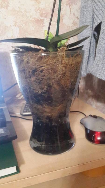 - Для этого способа необходимо выбрать прозрачную емкость, в которой свободно поместится основание орхидеи и поместить в нее растение так, чтобы основание корня было немного выше дна.