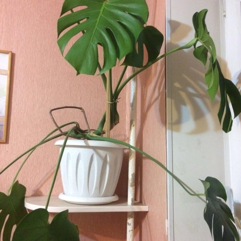 Ещё одна особенность, которую нужно учитывать: лиана, разрастаясь вверх, внизу остаётся той же толщины, что и первоначальный черенок. То есть внизу стебель часто оказывается тоньше, чем вверху. Из-за этого лиана может сломаться. Что делать? Во-первых, выбирать для размножения толстый стеблевой черенок. А во-вторых, сразу предусмотрите подпорки для новых побегов, которые будут появляться по мере роста. Монстера требует опоры. В-третьих, если ствол снизу оказался очень тонким, его можно попробовать углубить в землю.